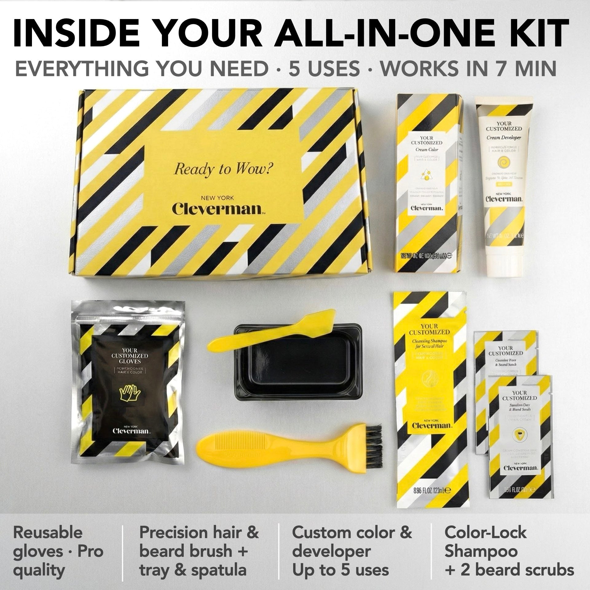 All-in-one hair & beard dye kit for natural-looking gray coverage on hair, beard, and mustache. Fast 7-minute results, lasts up to 5 weeks. Ammonia-free, vegan formula with nourishing oils. Easy to use and reusable, with up to 5 applications per kit (2.0 Oz).