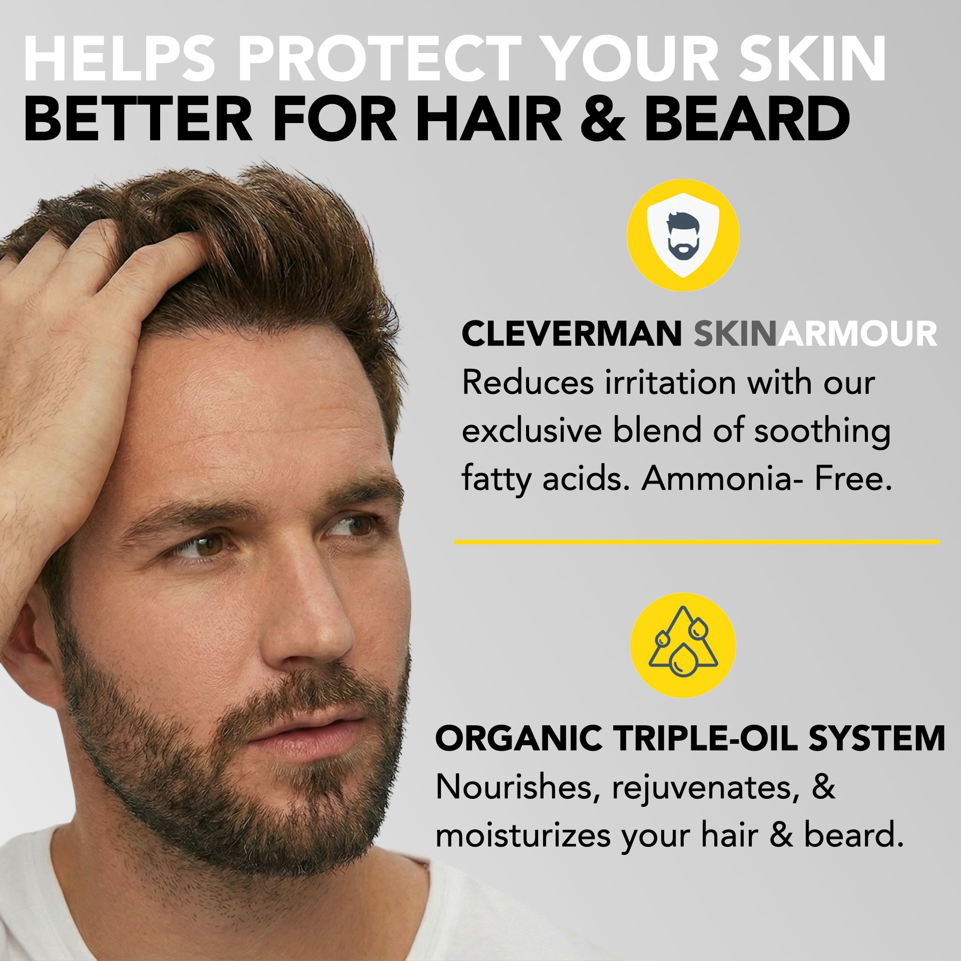 - Clean Color Formula – Gentle on hair and skin, Cleverman’s vegan hair dye formula contains no ammonia; enriched with a triple organic oil system, the beard and mustache dye, developer, and shampoo nourish and provide rich, lasting color